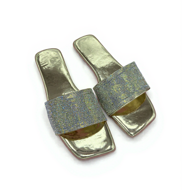 Step into sparkle with the Crystal Charm Flat—where comfort meets pure elegance. Designed with a sleek silhouette and adorned with shimmering accents, these flats bring a subtle yet captivating sparkle to your every step.